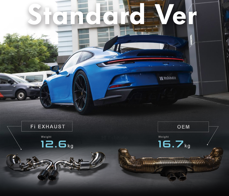 Fi EXHAUST for 992 GT3 / RS significantly reduces weight by 3.9kg compared to the factory setup, enhancing overall performance and handling.